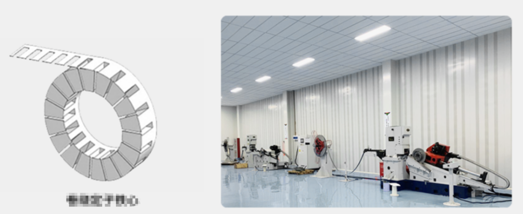Stator Core Punching and Rolling Molding Process The stator core of the product adopts one-time molding process of punching and coiling, which has a very high material utilization rate and reduces the raw material cost by 30% compared with that of punching core; and the axial permanent magnet disk motor, with its unique magnetic flux structure, determines that its axial thickness is thinner than that of conventional motors by more than 2/3. The rotor disk is similar in structure to the flywheel and is axially mounted, which can replace the flywheel part of the range extender, not only reducing the manufacturing cost to a larger extent in the design and development of the range extender, but also improving the energy conversion efficiency.