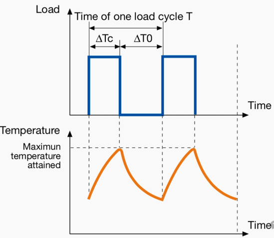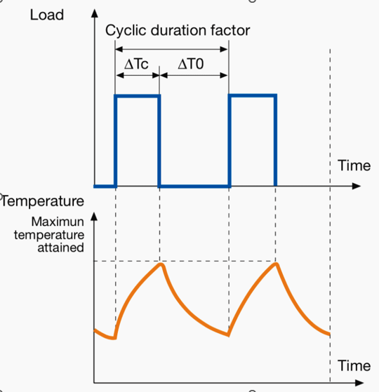 S3 Intermittent cyclic operation It has continuous, identical running and stationary cycles with a constant load. Temperature equilibrium is never reached. The starting current has little effect on the temperature rise.