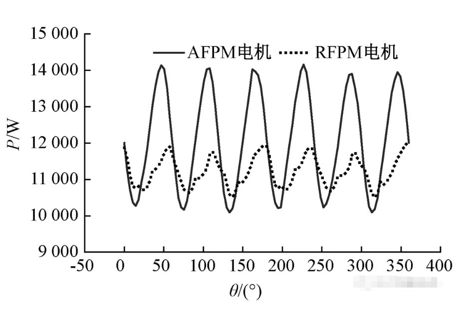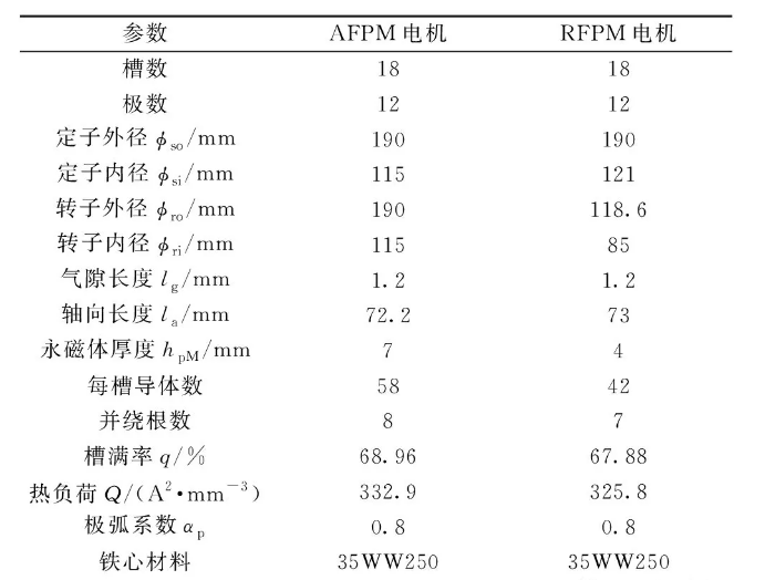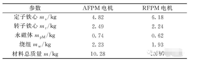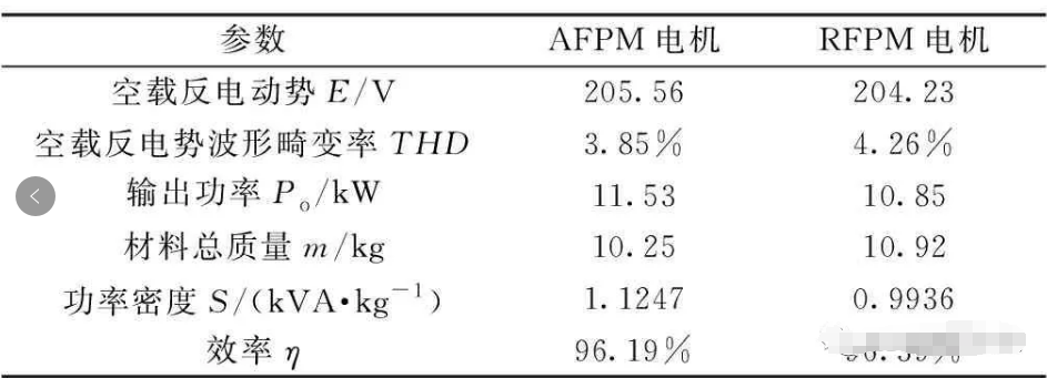 As can be seen from Table 3 and FIG. 6, the AFPM motor requires more permanent magnets than the RFPM motor to produce the same no-load counter electromotive force. In addition, the AFPM motor winding ends are longer, resulting in more winding usage. The power density of the AFPM motor and the RFPM motor is 1.175kVA / kg and 1.022kVA / kg respectively, and the power density of the AFPM motor is 14.97% higher than that of the RFPM motor. The results show that AFPM machines with single stator and single rotor structure have higher power density and higher material utilization.