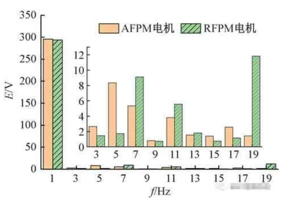 Fig. 7 is the Fourier decomposition diagram of no-load counter electromotive force. As can be seen from FIG. 7, the AFPM motor has more 3rd, 5th, 9th, and 17th harmonics than the RFPM motor, while the RFPM motor has more 7th, 11th, 13th, and 19th harmonics than the AFPM motor. The total harmonic distortion rate (THD) of voltage waveform of AFPM and RFPM motors is 3.91% and 5.55%, respectively. The harmonic content of AFPM motors is less and the THD is smaller. The sinusoidal waveform of no-load counter electromotive force of AFPM motor is better than that of RFPM motor.