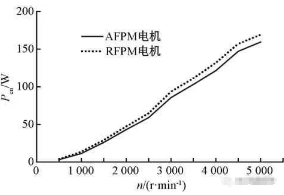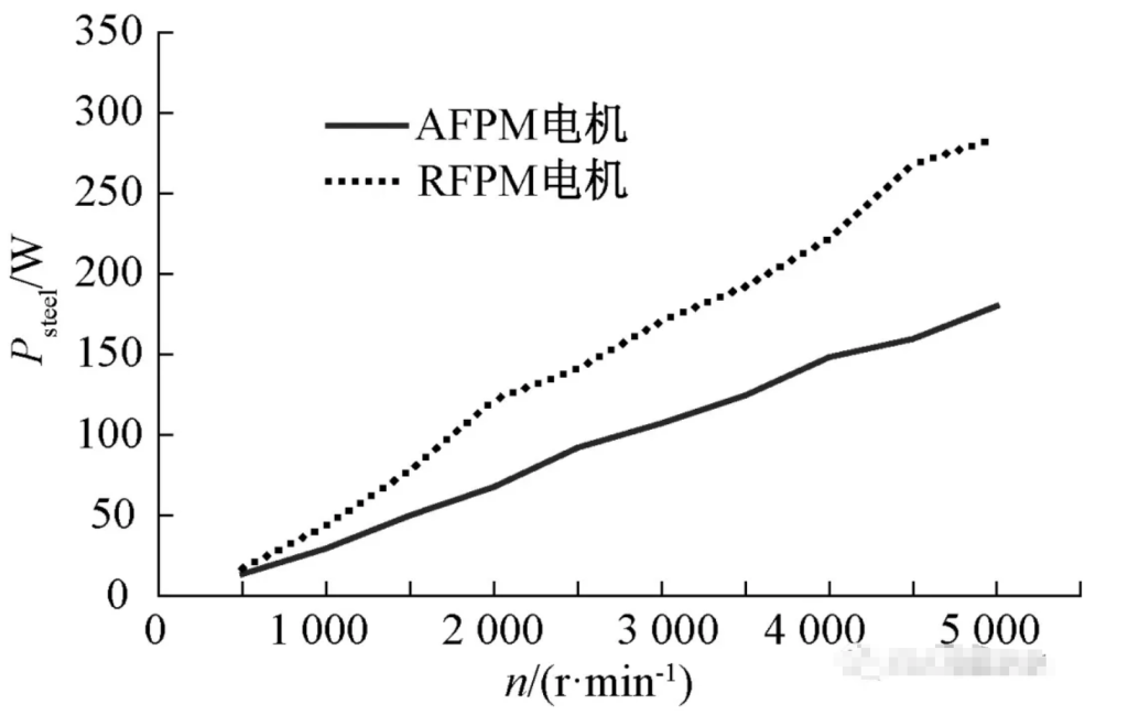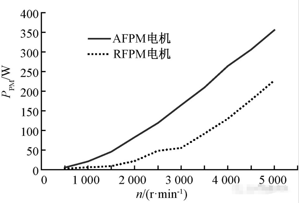 Iron loss, permanent magnet eddy current loss and copper loss are the main parts of the total loss. Fig. 10 and Fig. 11 are the curves of stator and rotor core loss and permanent magnet eddy current loss at different speeds. According to FIGS. 10 and 11, the difference between the core loss and the eddy current loss of the two motors is small at low speed (< 1 000 r / min); With the increase of motor speed, the core loss of RFPM motor is much higher than that of AFPM motor, and the eddy current loss of AFPM motor is higher than that of RFPM motor. Under the condition that the magnetic densities of the tooth, yoke and air gap are almost the same, the core loss and the eddy current loss of the permanent magnet are only related to the volume of the effective material. This is the main reason why the two different topology motors have a large loss difference, from Table 3, compared to the RFPM motor, AFPM motor core material is less, the permanent magnet material is more.